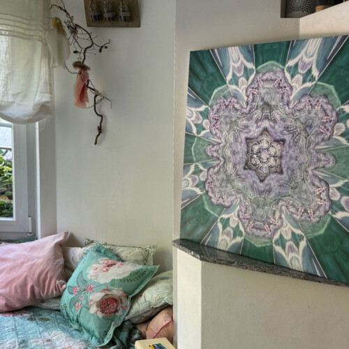 Sehr kraftvoll und mit starker Präsenz ist das Bild bei mir eingezogen.Es besteht eine große Resonanz zwischen mir und dem Bild - mein Blick wird im Vorbeigehen magisch angezogen und auch anderen Menschen fällt es schnell ins Auge. Die Farben umhüllen mich und tun mir gut.Sein Platz war schnell klar und der ganze Raum hat sich positiv verändert…. doch irgendwann begann es Impulse in mir auszulösen und ich habe den Platz gewechselt. So ist es bis heute - das Bild spricht förmlich mit mir und möchte von Zeit zu Zeit an anderer Stelle wirken.Wie wunderbar!